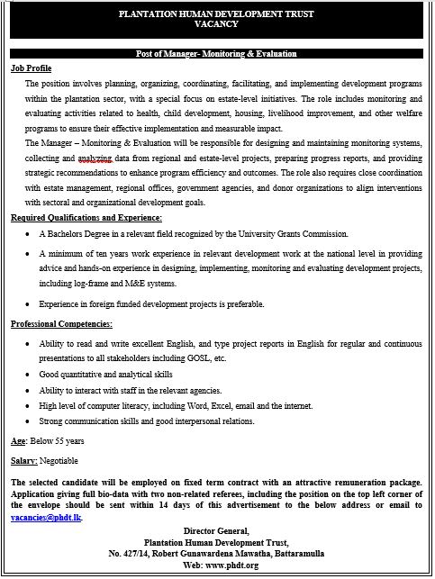 Job Profile The position involves planning, organizing, coordinating, facilitating, and implementing development programs within the plantation sector, with a special focus on estate-level initiatives. The role includes monitoring and evaluating activities related to health, child development, housing, livelihood improvement, and other welfare programs to ensure their effective implementation and measurable impact. The Manager – Monitoring & Evaluation will be responsible for designing and maintaining monitoring systems, collecting and analyzing data from regional and estate-level projects, preparing progress reports, and providing strategic recommendations to enhance program efficiency and outcomes. The role also requires close coordination with estate management, regional offices, government agencies, and donor organizations to align interventions with sectoral and organizational development goals. Required Qualifications and Experience: • A Bachelors Degree in a relevant field recognized by the University Grants Commission. • A minimum of ten years work experience in relevant development work at the national level in providing advice and hands-on experience in designing, implementing, monitoring and evaluating development projects, including log-frame and M&E systems. • Experience in foreign funded development projects is preferable.