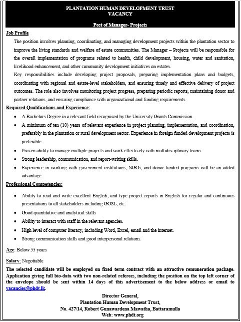 Job Profile The position involves planning, coordinating, and managing development projects within the plantation sector to improve the living standards and welfare of estate communities. The Manager – Projects will be responsible for the overall implementation of programs related to health, child development, housing, water and sanitation, livelihood enhancement, and other community development initiatives on estates. Key responsibilities include developing project proposals, preparing implementation plans and budgets, coordinating with regional and estate-level stakeholders, and ensuring timely and effective delivery of project outcomes. The role also involves monitoring project progress, preparing periodic reports, maintaining donor and partner relations, and ensuring compliance with organizational and funding requirements. Required Qualifications and Experience: • A Bachelors Degree in a relevant field recognized by the University Grants Commission. • A minimum of ten (10) years of relevant experience in project planning, implementation, and coordination, preferably in the plantation or rural development sector. Experience in foreign funded development projects is preferable. • Proven ability to manage multiple projects and work effectively with multidisciplinary teams. • Strong leadership, communication, and report-writing skills. • Experience in working with government institutions, NGOs, and donor-funded programs will be an added advantage.