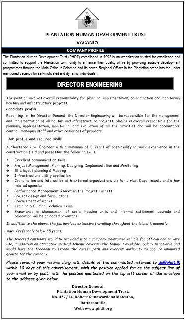Job Profile Location : Badulla Qualifications & Experience: NDT, NDES or HNDT in civil Engineering with more than 02 years’ experience or NCT (Civil) / NCIT (Civil) with more than 07 years’ experience in small scale housing, rural water supply, community infrastructure and related development projects. Experience is required in community mobilization, community-based project development & implementation, tender procedure and contract administration. Age: preferably below 45 years.