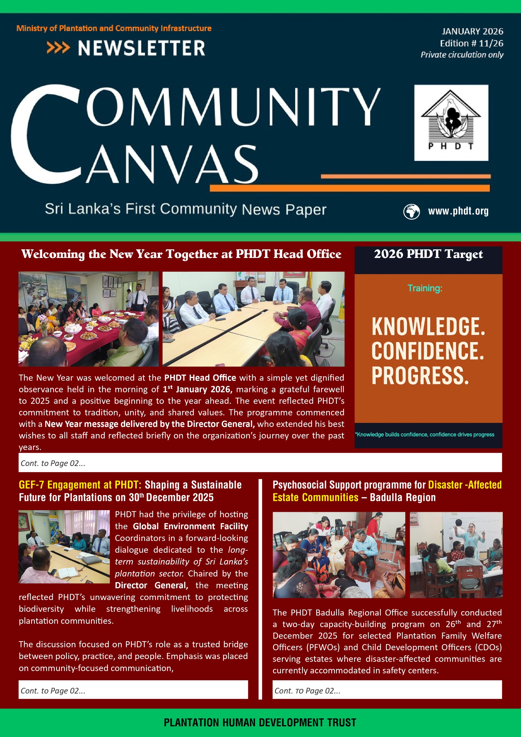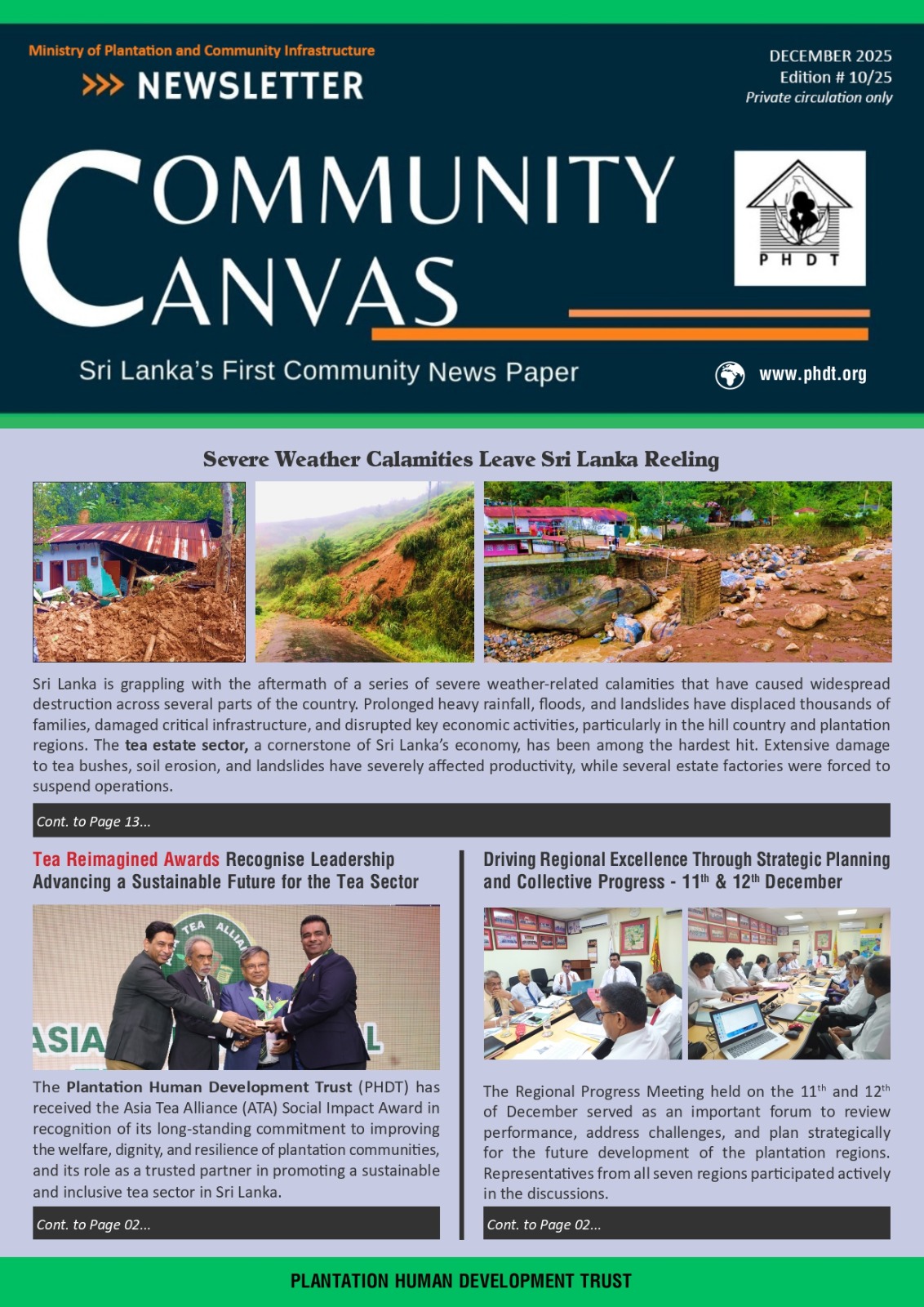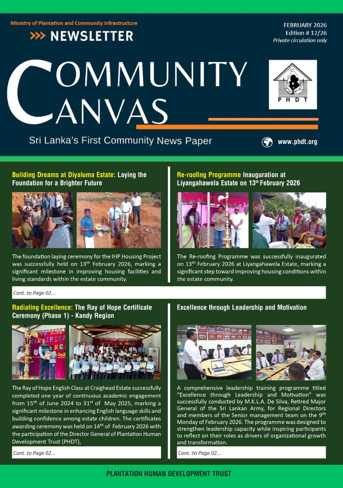 Stay updated with the latest developments from the Plantation Human Development Trust (PHDT) through our community canvas newsletters. These publications provide insights into the ongoing projects, community initiatives, and success stories from across various plantation regions in Sri Lanka. Each newsletter highlights key activities, achievements, and the efforts made to improve the lives of plantation workers and their families.
