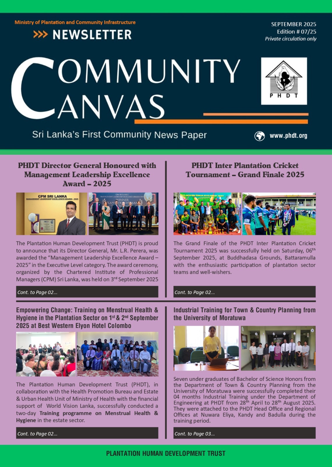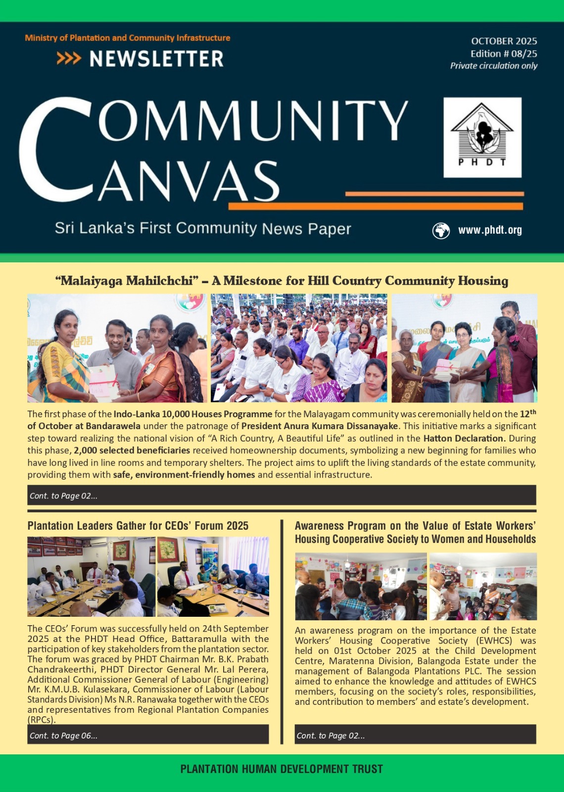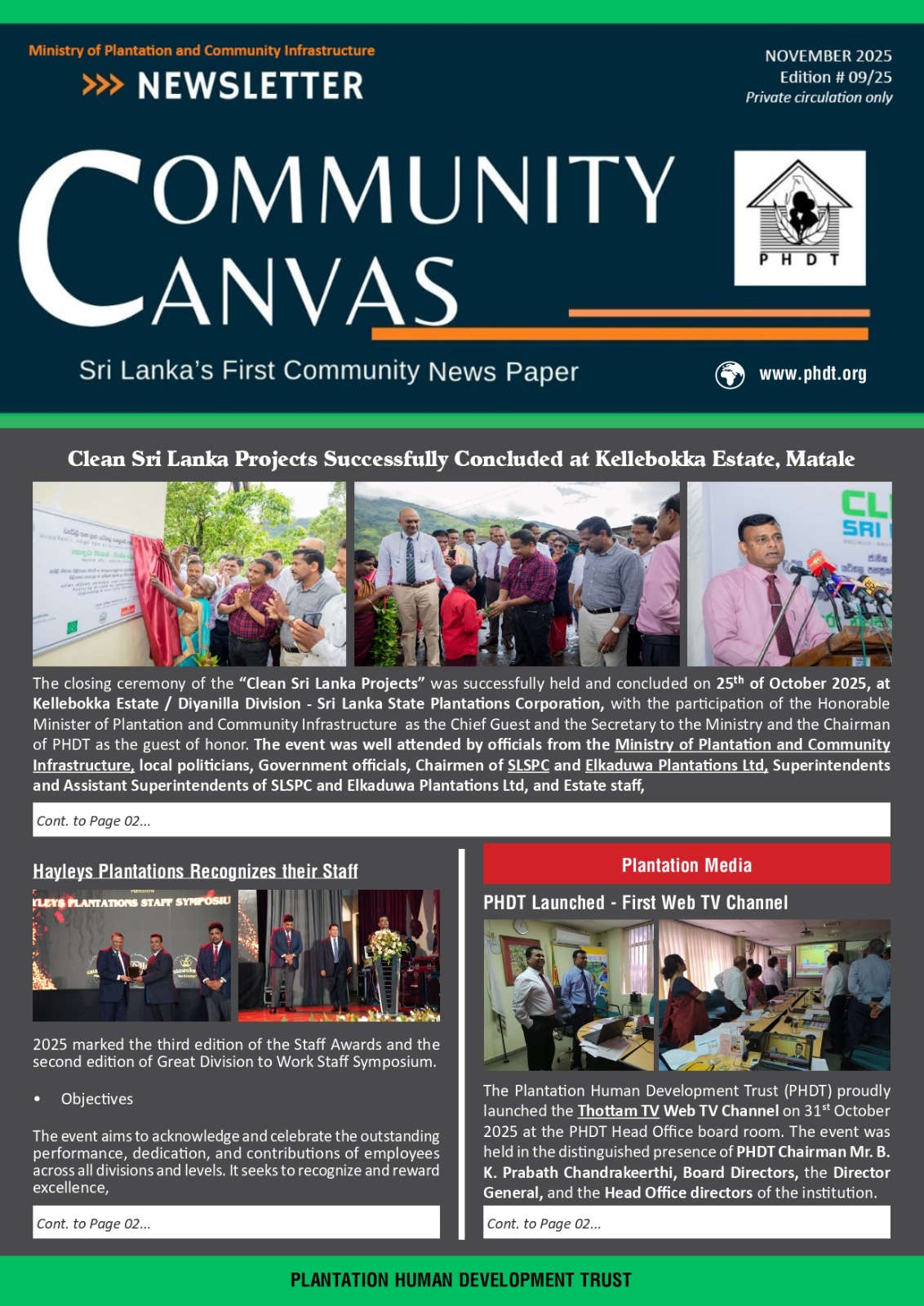 Stay updated with the latest developments from the Plantation Human Development Trust (PHDT) through our community canvas newsletters. These publications provide insights into the ongoing projects, community initiatives, and success stories from across various plantation regions in Sri Lanka. Each newsletter highlights key activities, achievements, and the efforts made to improve the lives of plantation workers and their families.